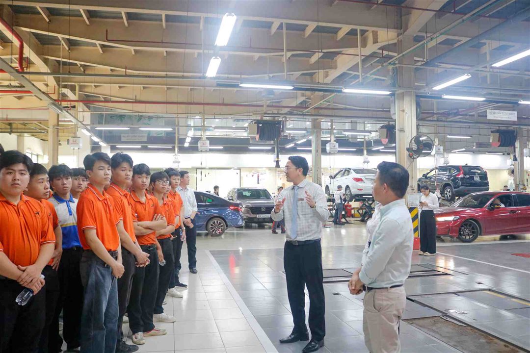 Tại buổi tham quan, sinh viên được đại diện doanh nghiệp giới thiệu tổng quan về hệ thống dịch vụ – sửa chữa – bảo dưỡng ô tô Honda, quy trình tiếp nhận xe, kiểm tra kỹ thuật, chẩn đoán lỗi bằng thiết bị chuyên dụng cũng như các tiêu chuẩn an toàn và chất lượng theo quy định của Honda Việt Nam. Đặc biệt, sinh viên có cơ hội trực tiếp quan sát dây chuyền làm việc tại xưởng dịch vụ, tiếp cận các công nghệ mới trên dòng xe Honda hiện đại.